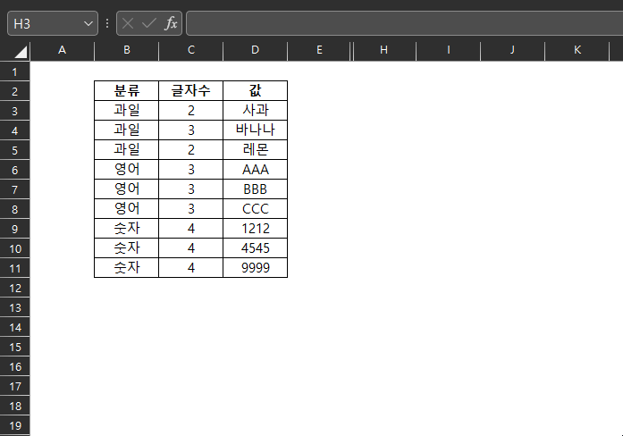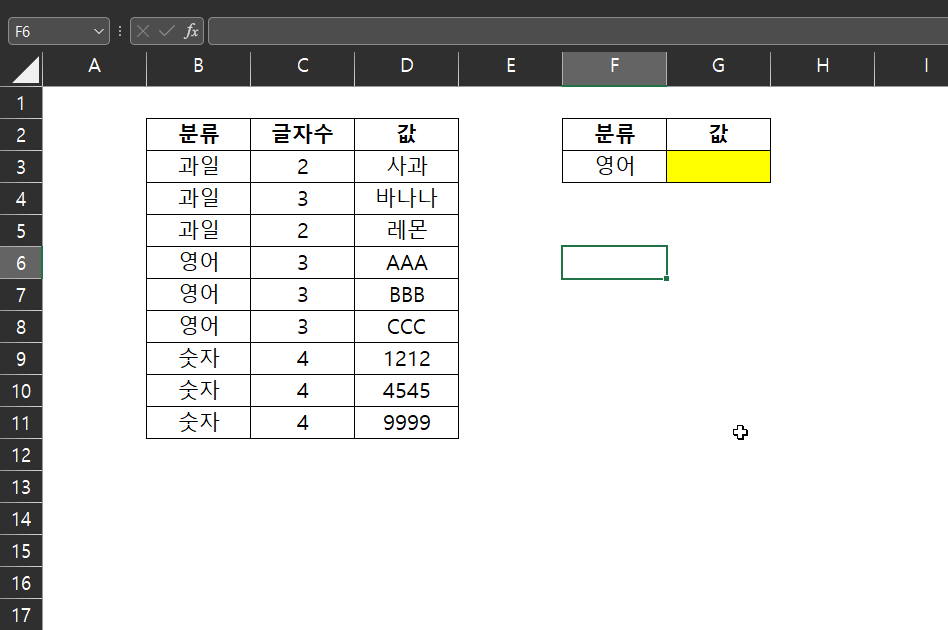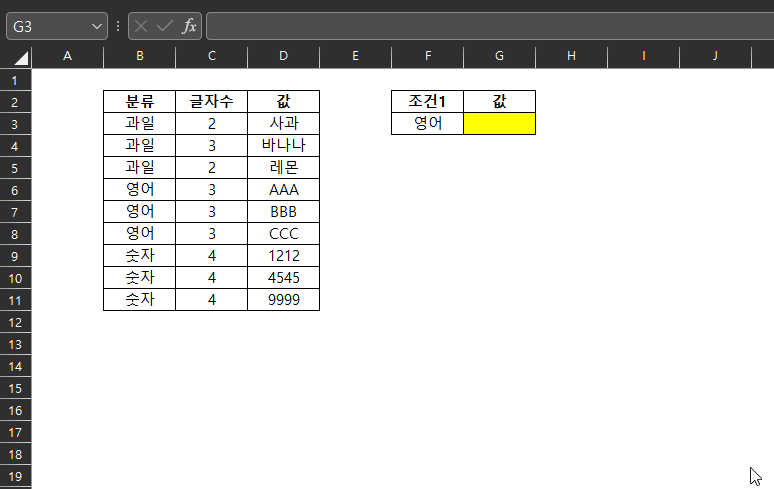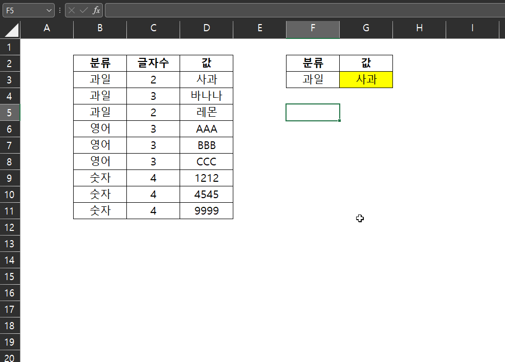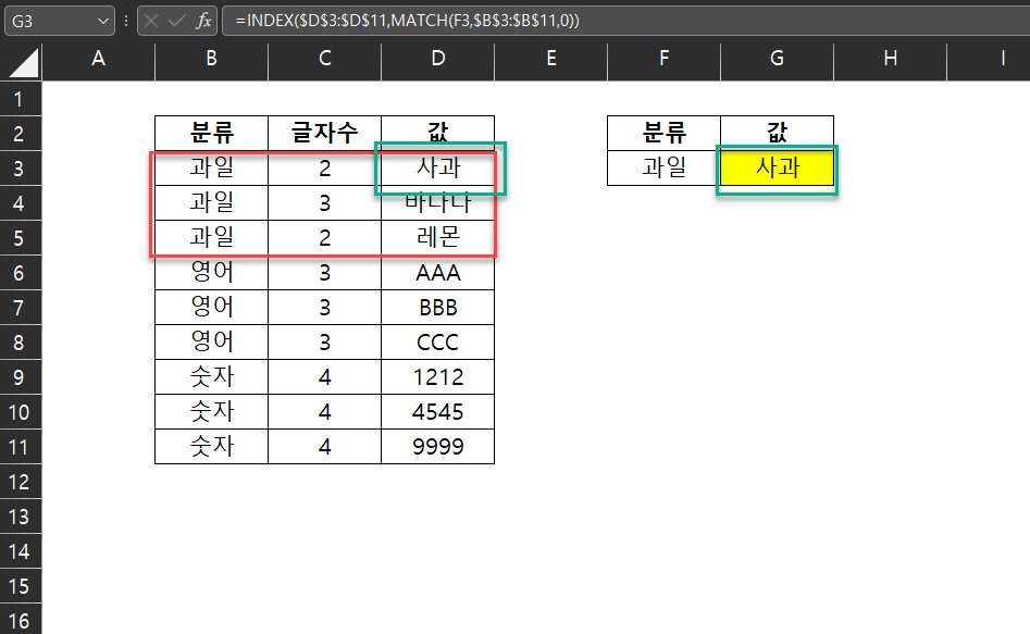후술하겠지만, 과일은 1번째 뿐만 아니라, 2번째와 3번째에도 존재하지만 MATCH 함수의 결과값은 항상 가장 윗 데이터, 혹은 가장 좌측 데이터 값만 반환한다.