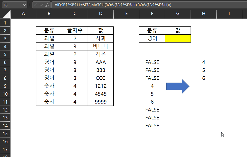 라는 생각을 누구나 할텐데, 그래서 저 행번호 위치에 MATCH 함수를 조합한다.