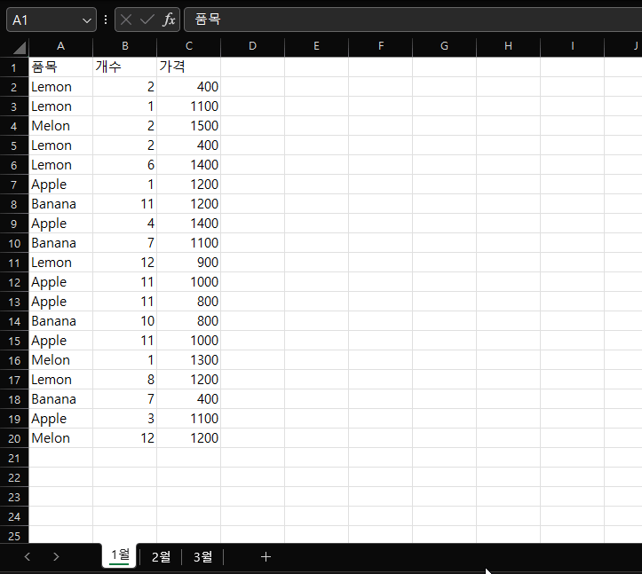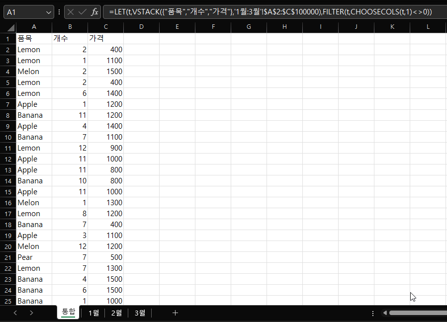 =LET(t,VSTACK({"품목","개수","가격"},'1월:3월'!$A$2:$C$100000),FILTER(t,CHOOSECOLS(t,1)<>0))