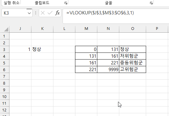 =VLOOKUP($J$3,{0,131,"정상";131,161,"저위험군";161,221,"중등위험군";221,9999,"고위험군"},3,1)