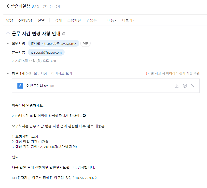 메일 본문 내용과 첨부파일까지 모두 정상적으로 잘 작성되어있다.