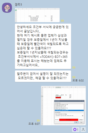 조건2 → D7셀을 오늘날짜와 비교하여 365일을 초과하는지 → TODAY()-$D7>365