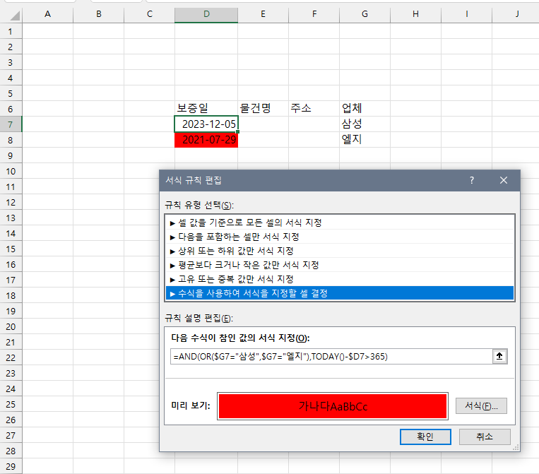 → AND(OR($G7="삼성",$G7="엘지"),TODAY()-$D7>365)